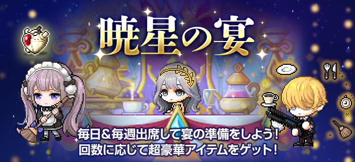暁色 | 5 | 2025年9月16日(火) 23:59 | 獲得数はメイプルID内で共有 イベント「暁星の明かり採集」でイベントスキル強化に使用可能 |